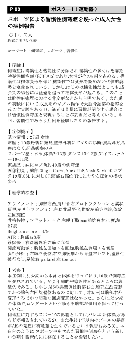 ◆スポーツによる習慣性側弯症を疑った成人女性の症例報告